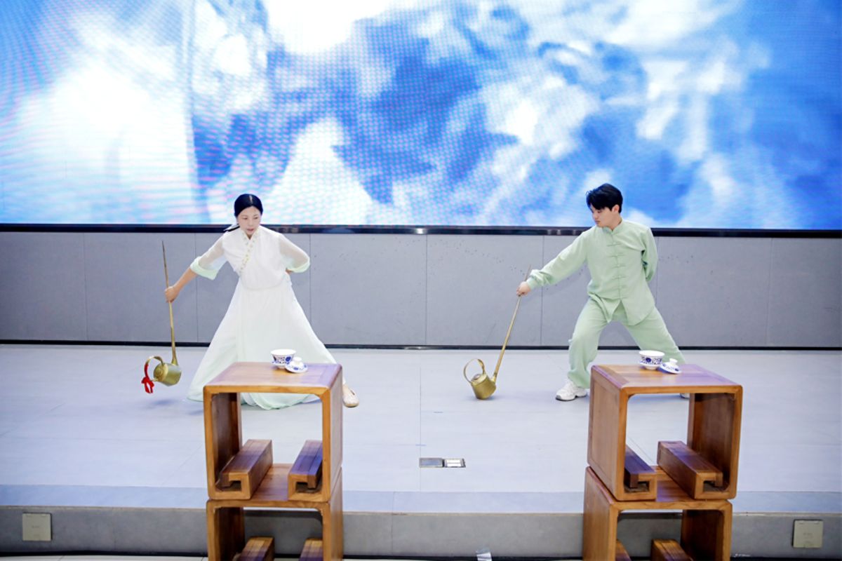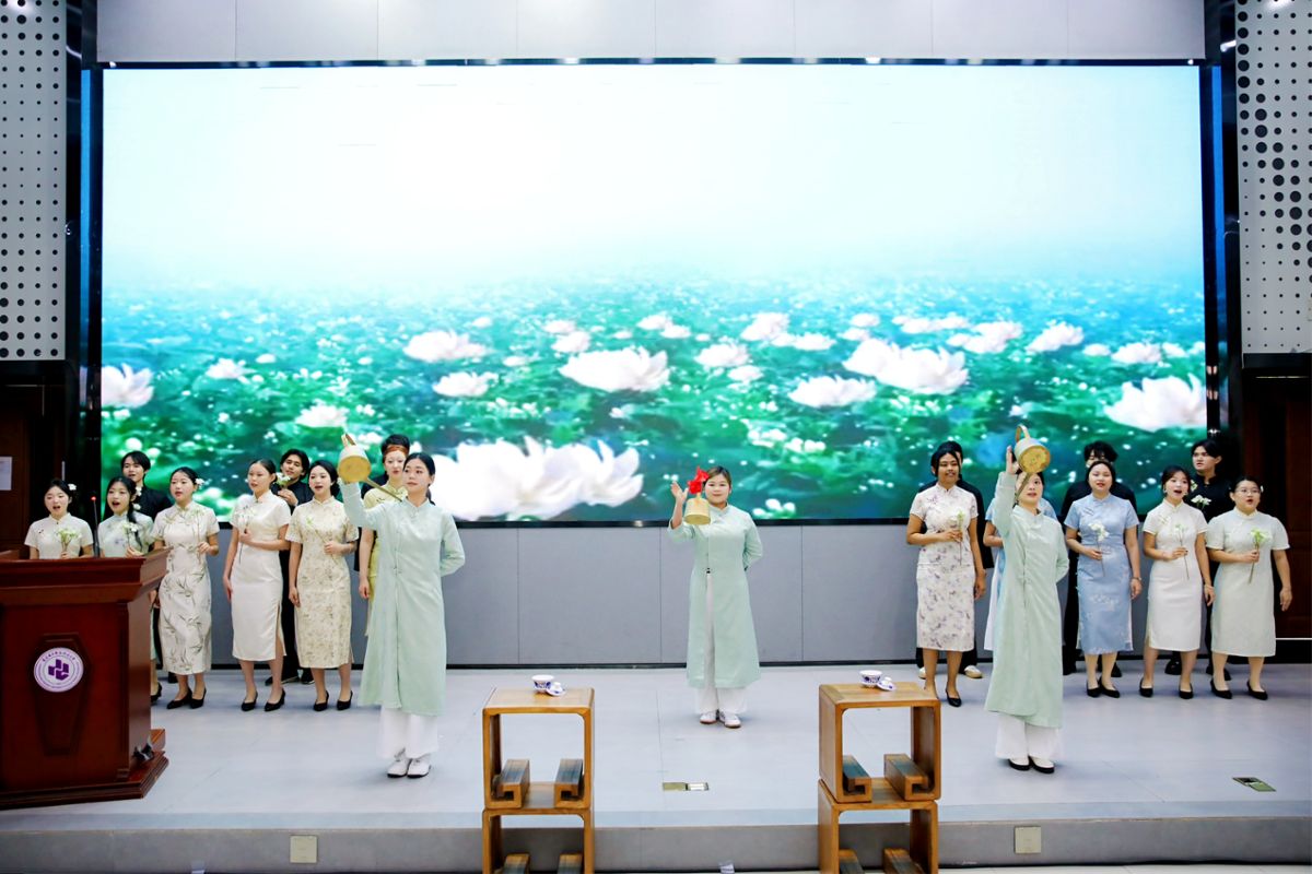 会议一开始,暖场节目首先呈现在观众眼前,舞台被淡雅的国风氛围笼罩,随着留学生们清澈婉转的《茉莉花》歌声缓缓响起,智慧健康学院的师生们身着新中式茶服登场,她们身姿曼妙,手持1.2米长的铜壶,以行云流水的动作演绎着长嘴壶茶艺的精髓,歌声与茶技交相辉映,将东方美学的雅致意境层层铺展,让现场嘉宾在沉浸式体验中,既感受到中国茶文化的深厚底蕴,也体会到中外文化交融的动人温度。