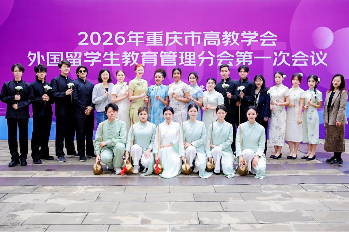2026年4月2日,由重庆市高等教育学会外国留学生教育管理分会主办、重庆电子科技职业大学承办的外国留学生教育管理分会第二届理事会第一次会员大会在我校博远厅隆重开幕。我校智慧健康学院师生带来的暖场节目惊艳亮相,将非遗长嘴壶茶艺与留学生《茉莉花》合唱巧妙融合,以一场6分钟的沉浸式视听盛宴拉开大会序幕,赢得全场参会人员的阵阵掌声与高度赞誉。