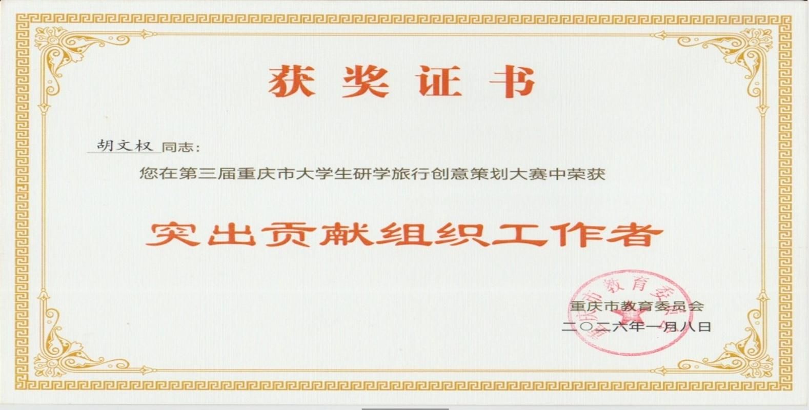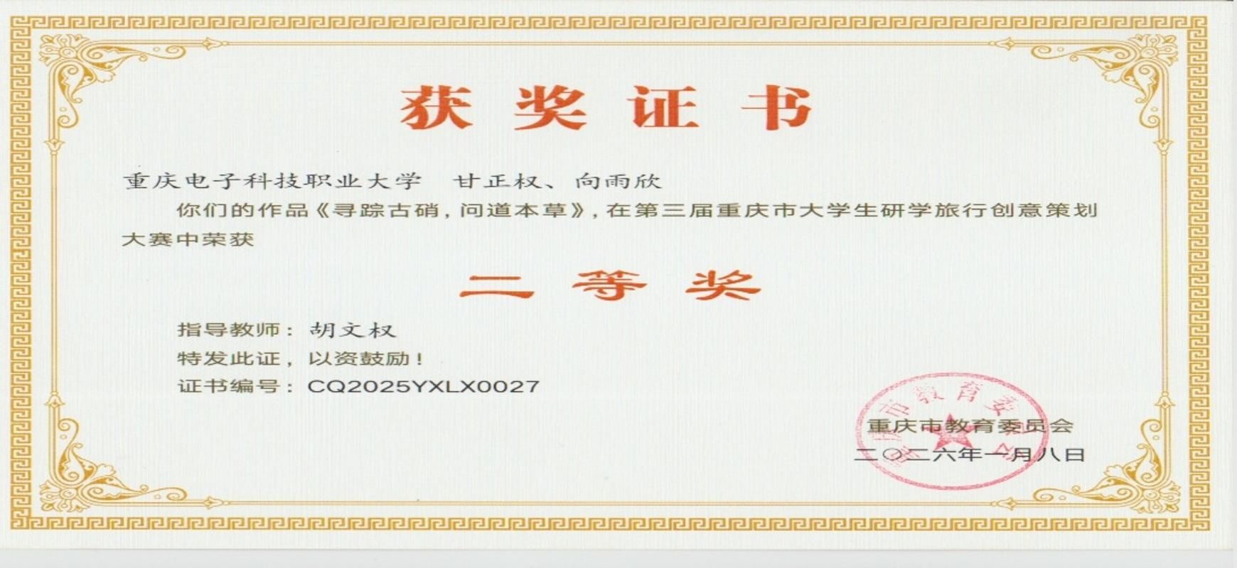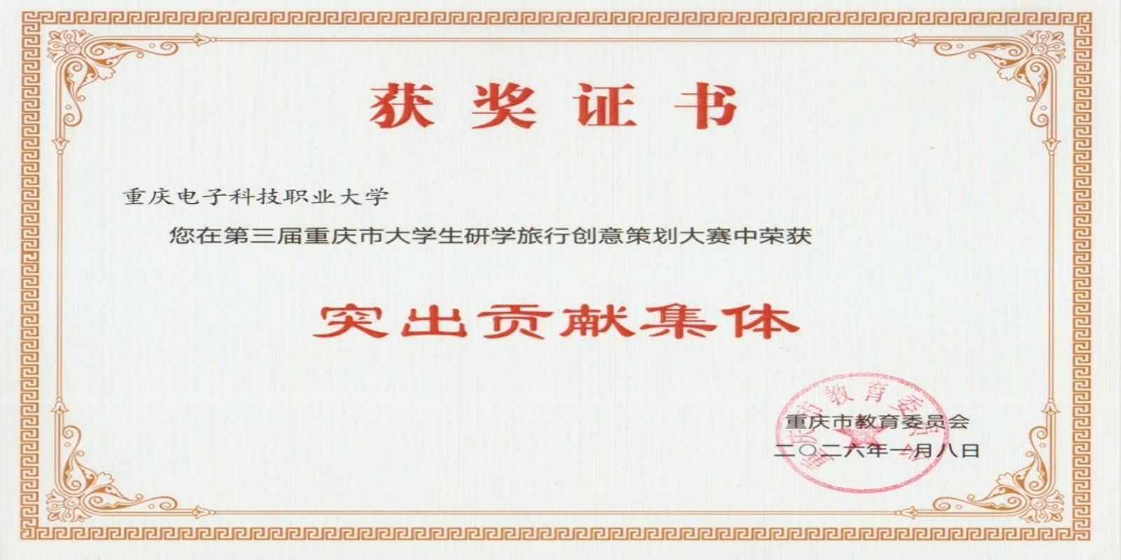 近日,由重庆市教育委员会主办,重庆第二师范学院、重庆市文化和旅游协会、重庆金佛山山水文旅发展集团有限公司、重庆市研学旅行产业研究院联合承办的第三届重庆市大学生研学旅行创意策划大赛获奖结果正式揭晓。由我校胡文权老师和余杰教授共同指导的学生团队荣获高职组二等奖。同时,重庆电子科技职业大学荣获“突出贡献集体”称号,我校智慧健康学院胡文权老师荣获“突出贡献组织工作者”称号。
