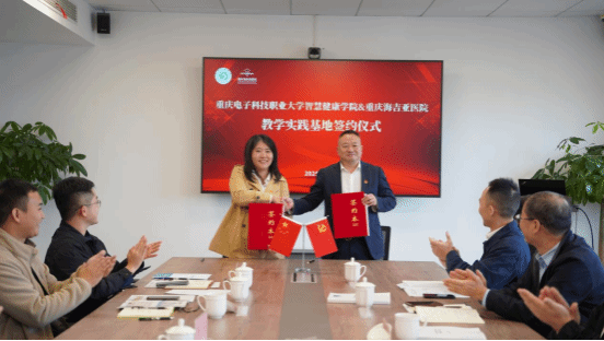 会谈尾声,在双方代表见证下,李卉副院长与重庆海吉亚医院党支部副书记王进文主任签署党建共建协议。双方表示,将以党支部联建为起点,深化党建与业务融合,以“党建红”引领“产教金”,助力健康产业发展,为“健康中国2030”培育高端技术技能人才。