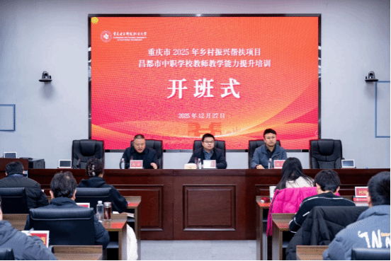 12月27日上午,重庆市2025年乡村振兴帮扶昌都中职学校教师教学能力培训班开班式在重庆电子科技职业大学大学城校区举行。智慧健康学院党总支书记谌喜兵、重电国培基地办公室副主任张亚、智慧健康学院医康设备系系主任赵云,以及来自昌都市中职学校的30名教师参加了开班式。