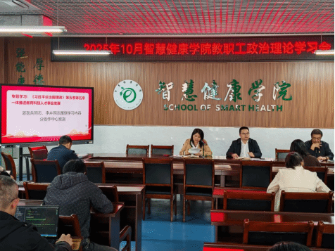2025年10月23日下午,智慧健康学院召开新学期教职工大会暨10月政治理论学习会议,组织全体教职工开展集中学习研讨,旨在筑牢思想根基、强化责任担当,为教育事业高质量发展注入动力。会议由学院党总支书记谌喜兵主持,学院全体教职工参加。